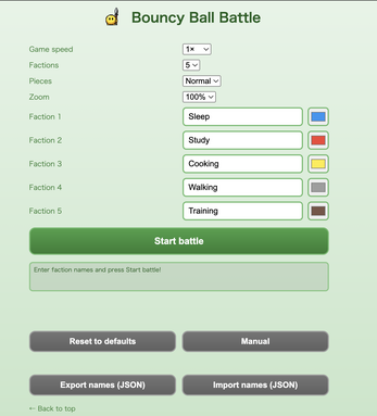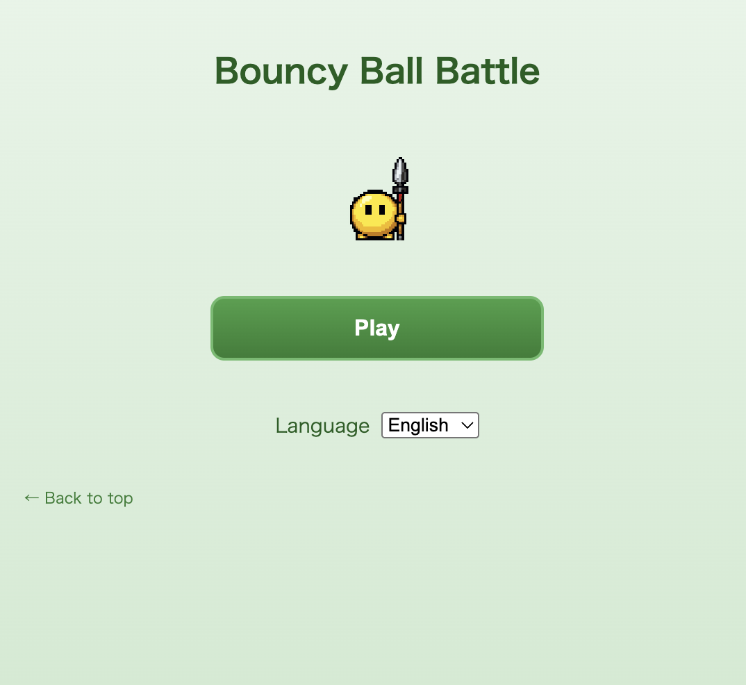 Bouncy Ball Battle is a physics-based arena game where bouncy balls fight it out.Choose your faction, equip weapons like katana, spear, and bow, and face off against the other side. Balls bounce, bump, and knock each other out until one team wins. Matches are quick and easy to jump into, with simple controls and no complicated rules.Good for a quick session alone or for passing the device around with friends.